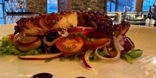Grilled Octopus Sicilian Style, served with fresh cherry tomatoes, red onion, black olives and balsamic reduction sauce.